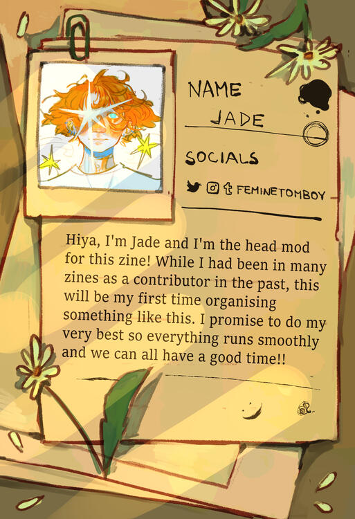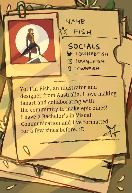 Each artist will be asked to illustrate one full page that will accompany each character's short story at its end. The drawing should be fully coloured with a background, and should be directly inspired by the text itself. As such, writers and artists will be encouraged to collaborate on designs.The character will be assigned to the artists based on their application. Artists are free to take up to 3 characters if they so wish (meaning they will have to produce 3 separate full-page pieces). This is determined in the applications.Artists can include as many characters as they want in their piece, as long as their assigned character is present, and as long as the characterisation is consistent throughout the zine.WILL THERE BE MERCHANDISE?We are currently looking into making digital merchandise, mainly phone and desktop wallpapers, but this will largely depend on our artists once the project has truly set off.