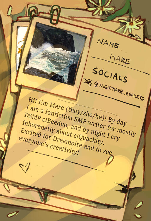 Dreamoire is a non-profit digital zine centered around myths and folklore surrounding the world of the Dream SMP. The zine plans to include a short story for each character of the DSMP, stylised as a folk tale and accompanied by an illustration inspired by the text itself. As such, it is more writer-focused than most zines.Due to the text-heavy nature of the zine, it will be available only as a pdf booklet and epub file, as printing this many pages isn't within our capability. The finished zine will be completely free-of-charge for anyone to enjoy.